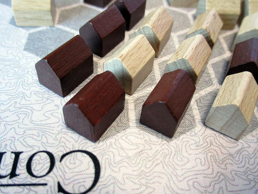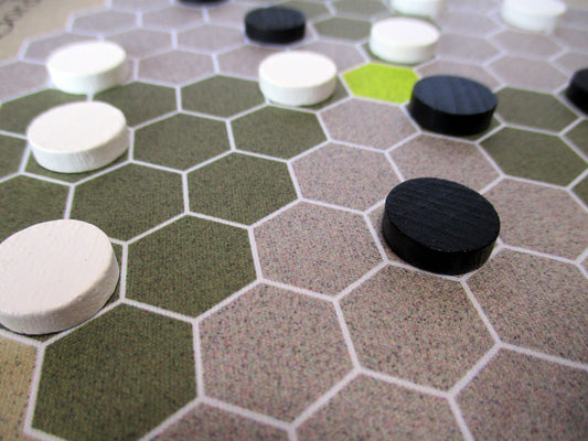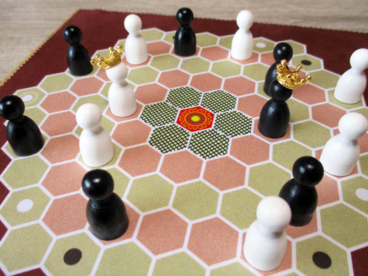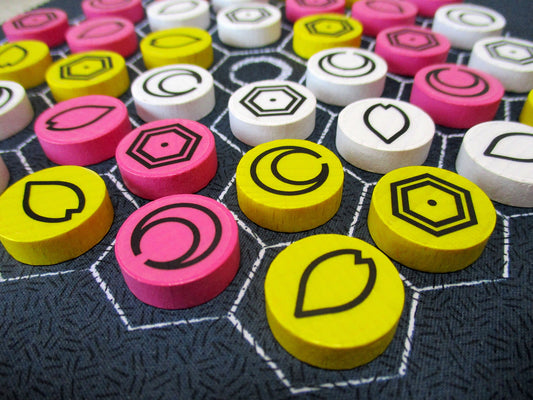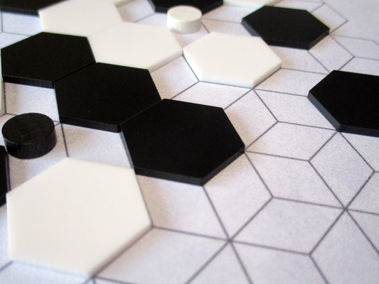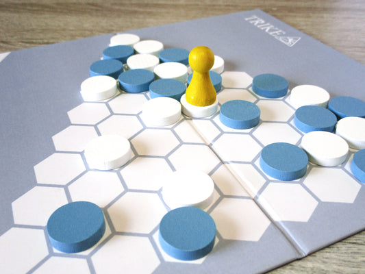 幾何学形状の美しいゲーム レジデュエルは、マイケル・アムンゼンのもう一つの意欲作です。プレイヤーは六角形のタイルをプレイし、タイルを置けずに残ったダイヤ形のスペースを取り合います。一筋縄ではいかない領土ゲーム、タイルは高品質なアクリル製です!