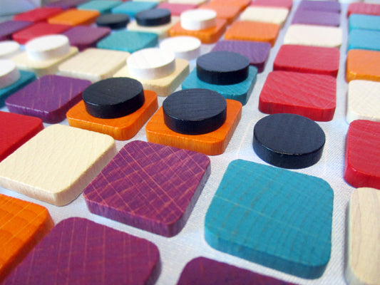 5色のかわいらしいタイルを敷き詰めてプレイするペイントスケープは、我々の新しいデザイナー マイケル・アムンゼンの意欲作です。自分のコマを縦横に追加していき、同じ色のタイルに6個のコマを置けたらその色を取得します。作者の巧妙な仕掛けを楽しんでください!