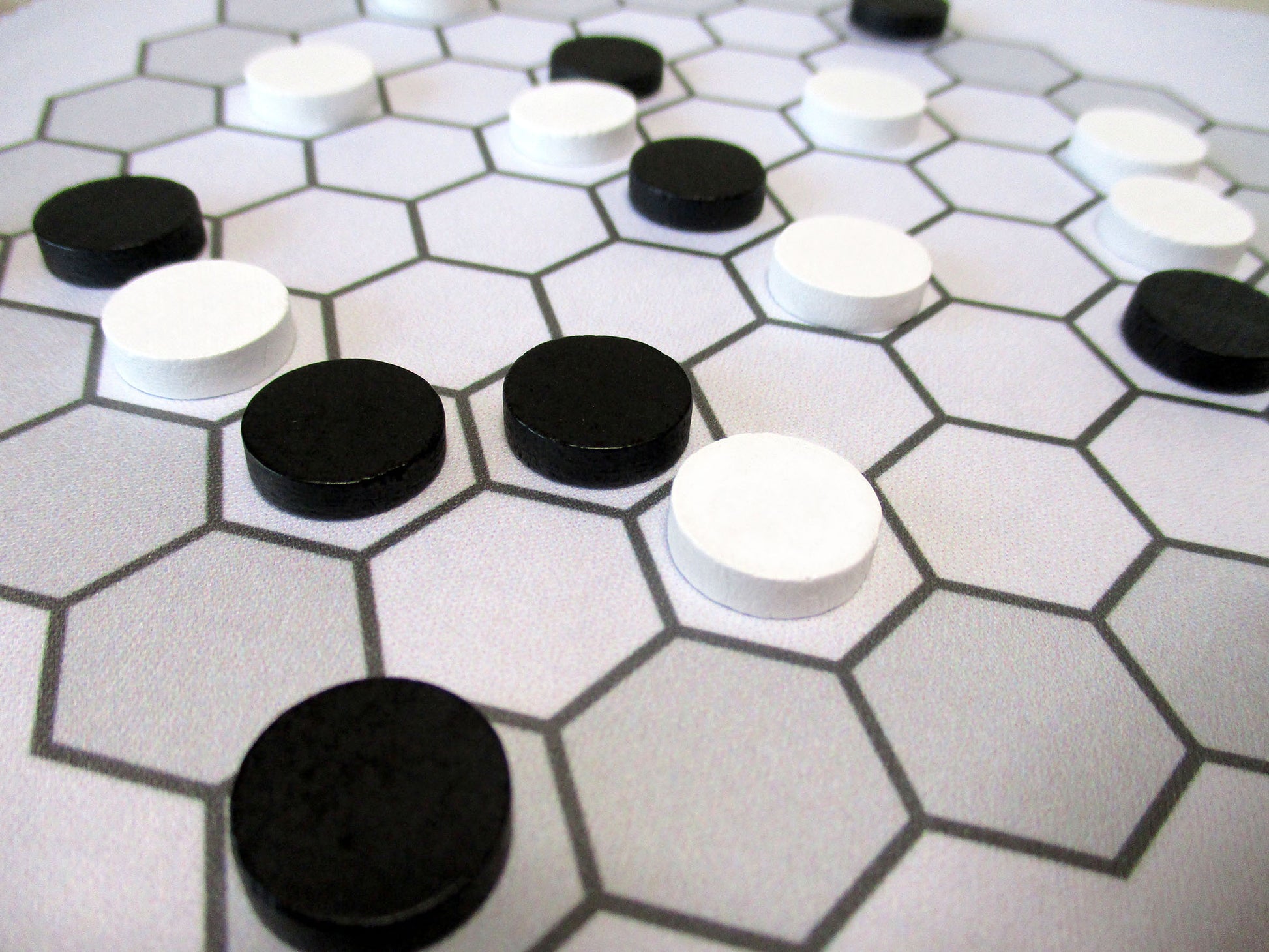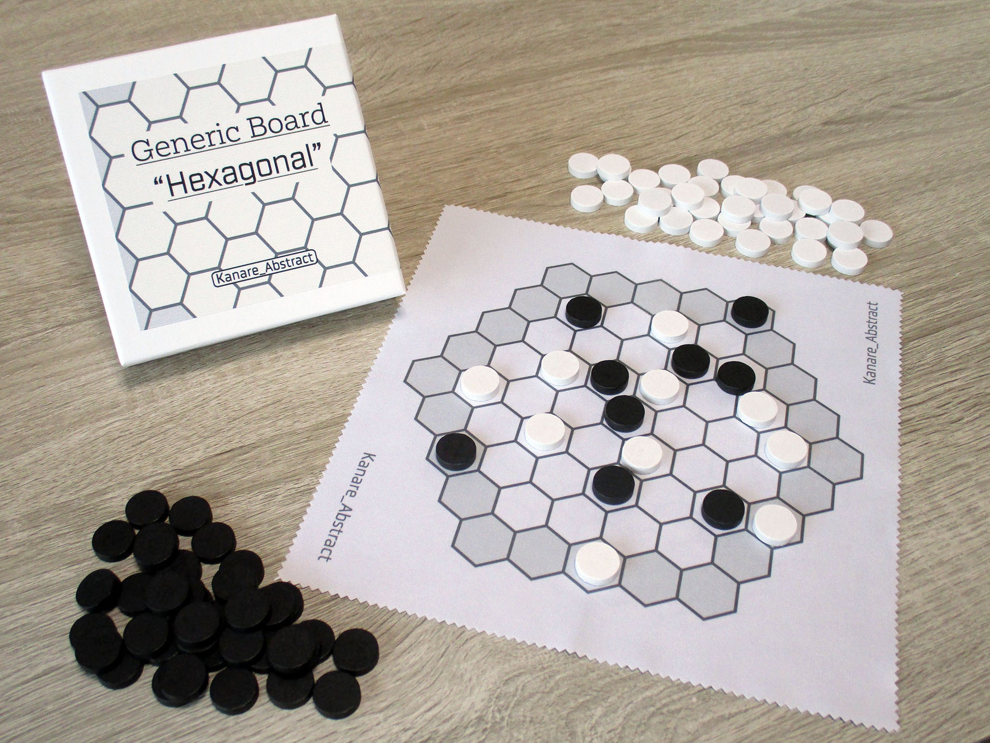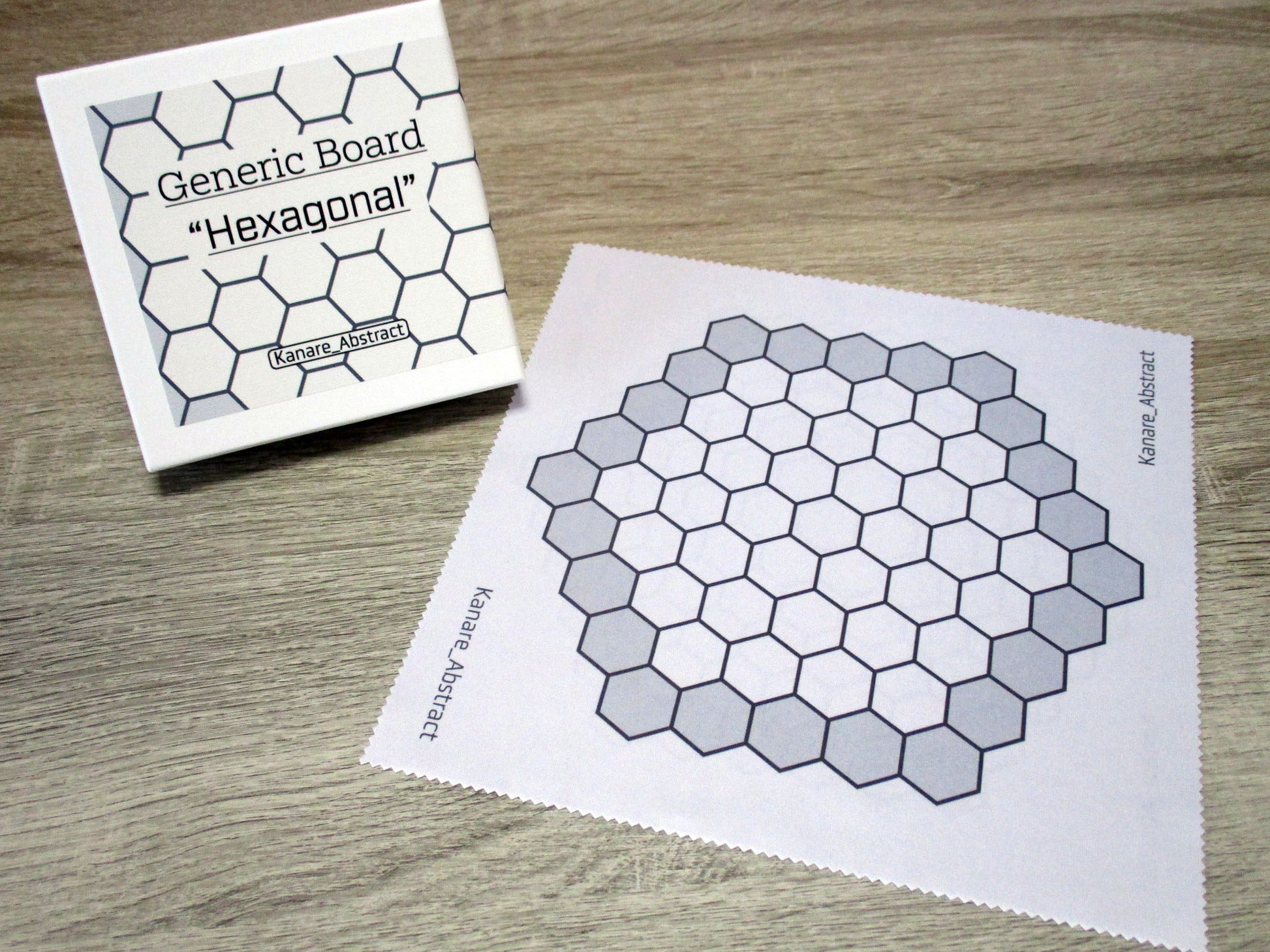 This is a regular hexagonal board designed for various abstract games. Printed on both sides, and can be used for games of various sizes with just this one (4/5 hexes per side on the front, 5/6 hexes per side on the back).
